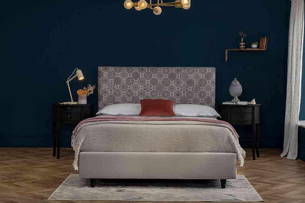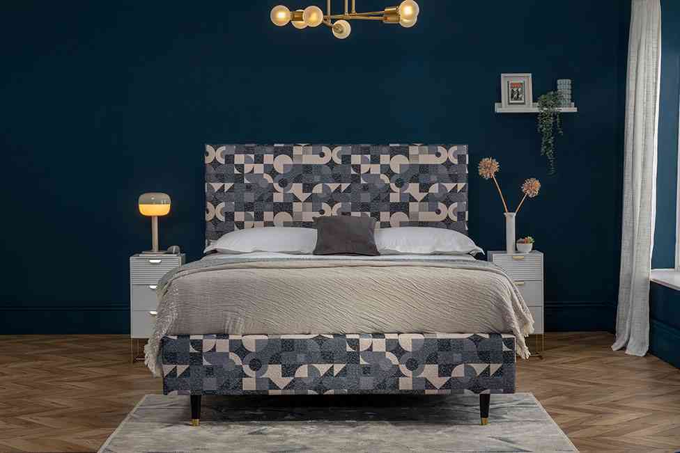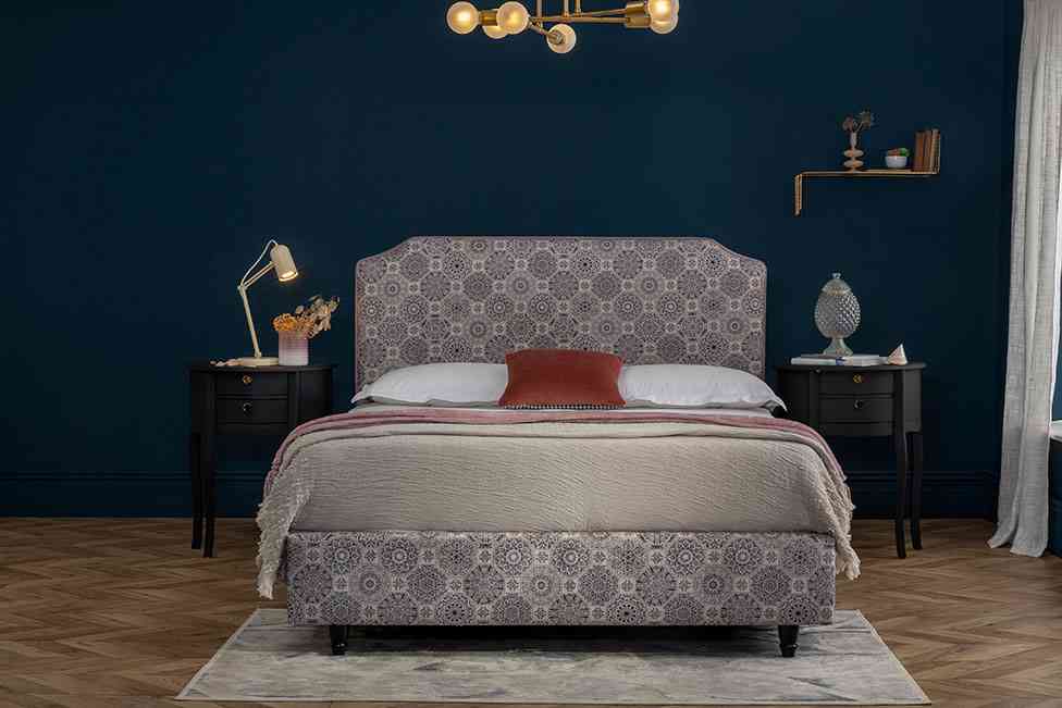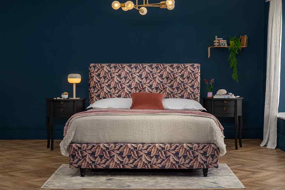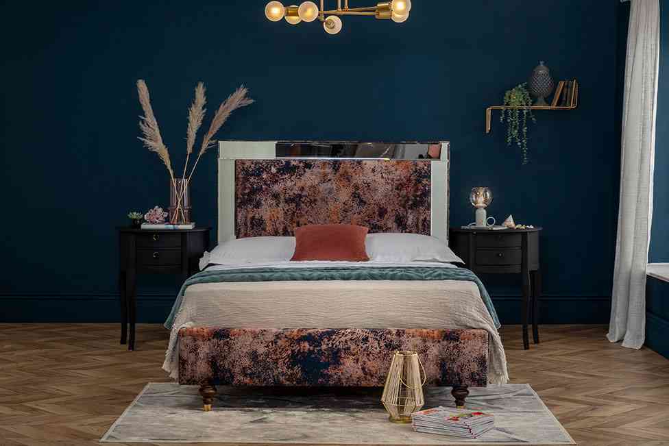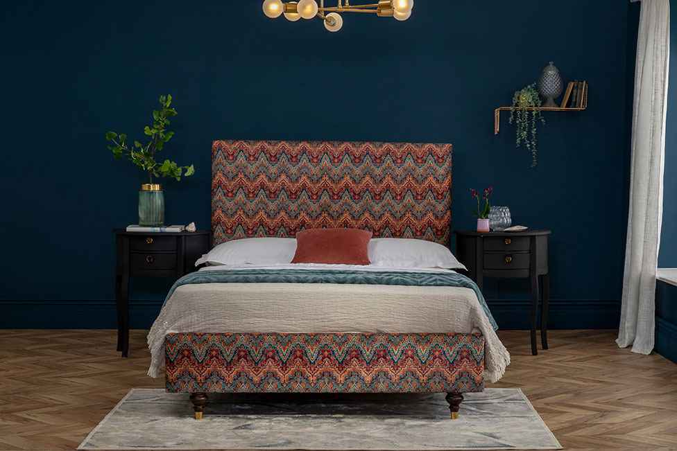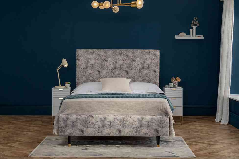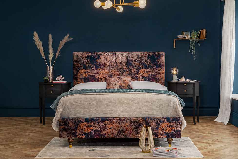 Mineral Copper Cavalier Bed a striking blend of artistry and comfort, featuring a tall plush headboard, intricate abstract upholstery, and refined wooden legs with metallic accents. Available in various bases including Ottoman frame. Flexible payments via Klarna and Clearpay.