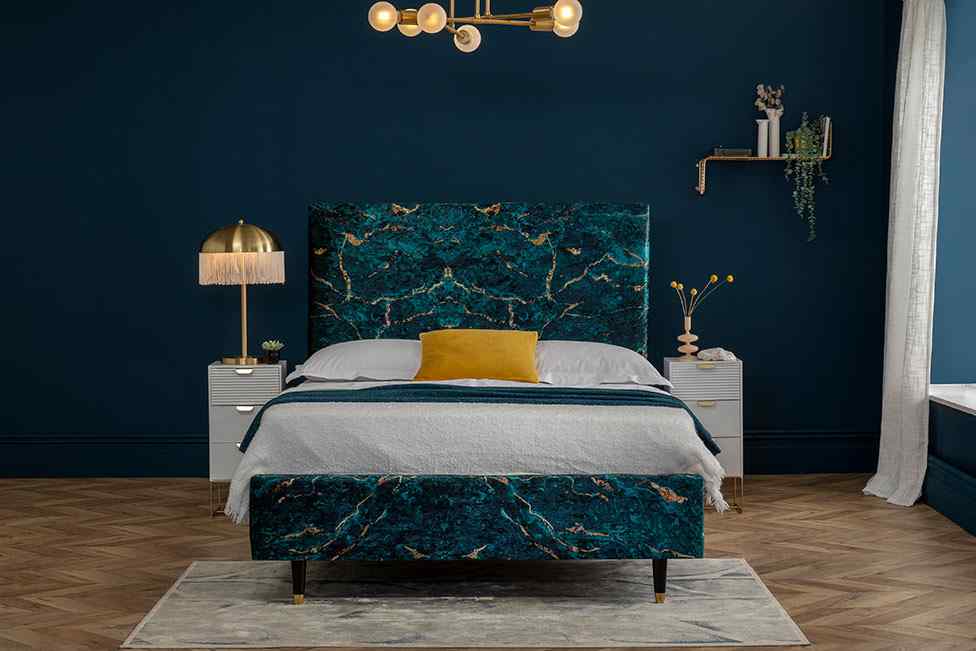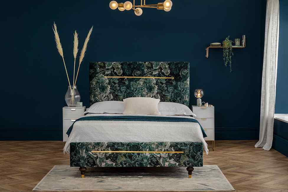 The Granite Marble Emerald Cavalier Bed showcases a tall marble-inspired headboard and premium seamless upholstery, exuding bold modern elegance and comfort. Available in various bases, including the Ottoman frame. Pay flexibly through Klarna or Clearpay.
