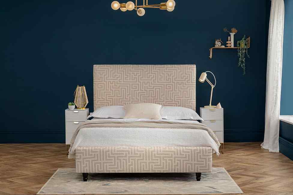 The Maze Teddy Ivory Cavalier Bed features a bold geometric headboard and soft textured upholstery, blending modern artistry with comfort and elegance. Available in various bases, including the Ottoman frame. Flexible payments offered via Klarna and Clearpay.