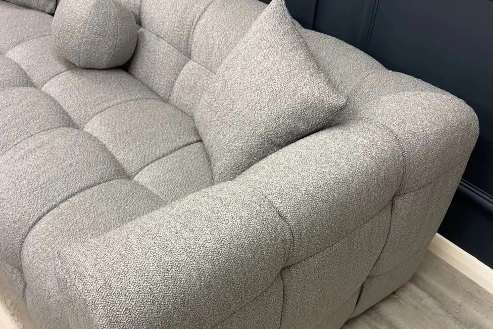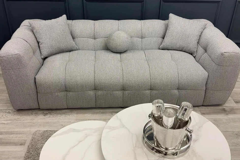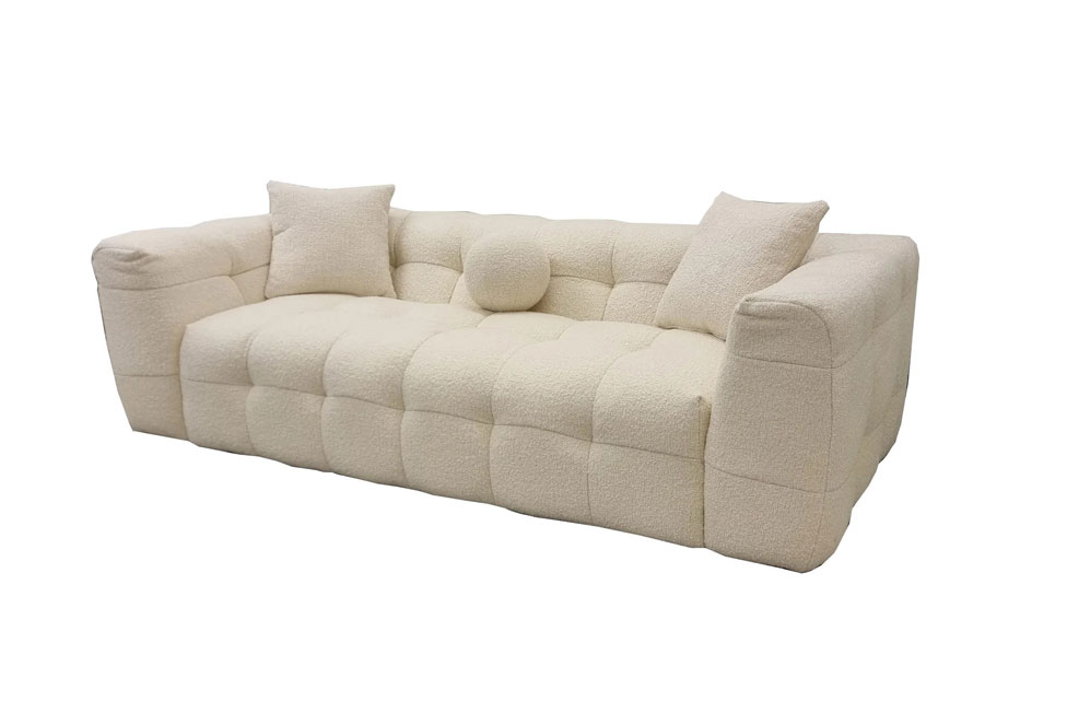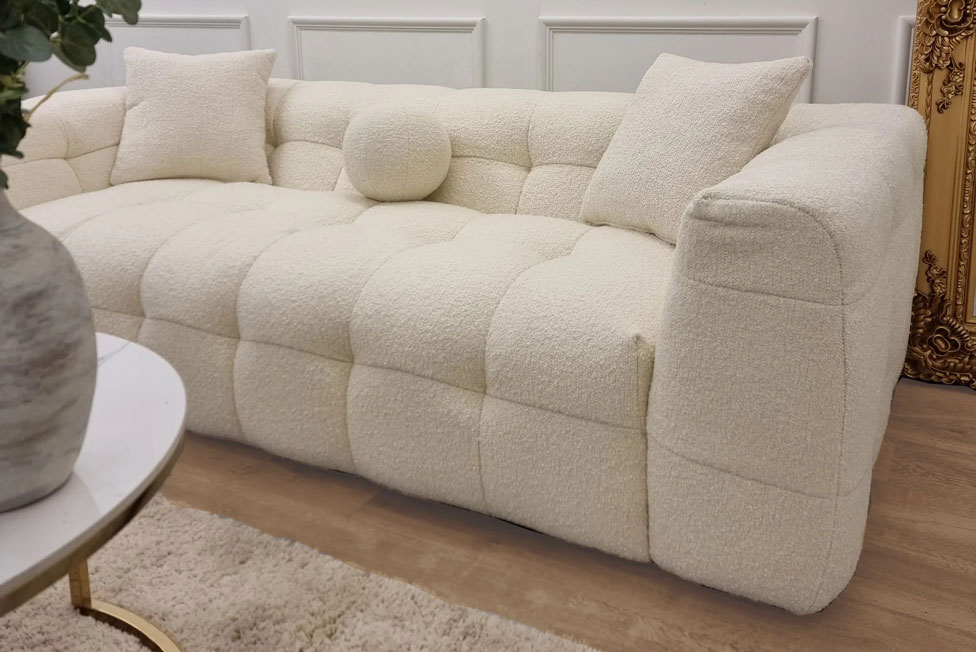 The Mellbour Woodford Bouclé 3 Seater Sofa embodies modern comfort and timeless elegance. Draped in luxuriously soft bouclé fabric, it creates a plush, cloud-like experience that invites you to unwind. Its bubble-tufted design and deep seating combine sculptural beauty with everyday functionality. Available in soothing neutrals like ivory and soft grey, it effortlessly complements any decor. With its refined silhouette, low arms, and premium cushioning, this sofa transforms any living room into a sanctuary of cozy sophistication.