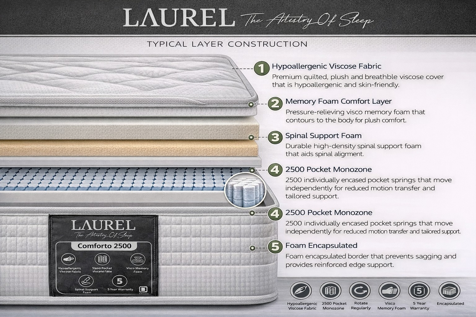 - The high-quality 2500 Pocket Spring System features a high-density spring count that offers exceptional support and precise body contouring.