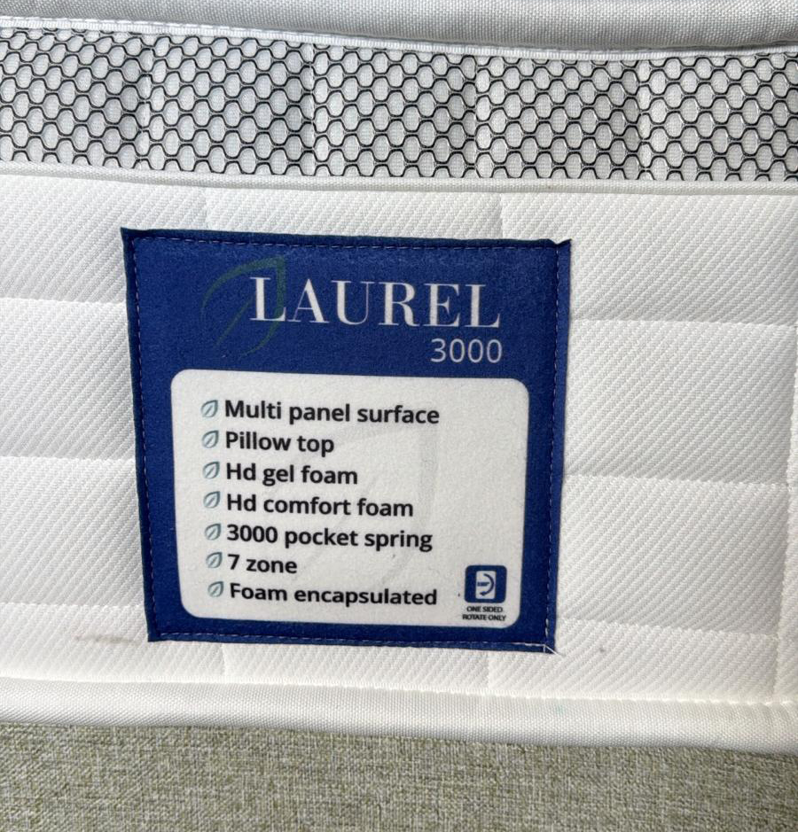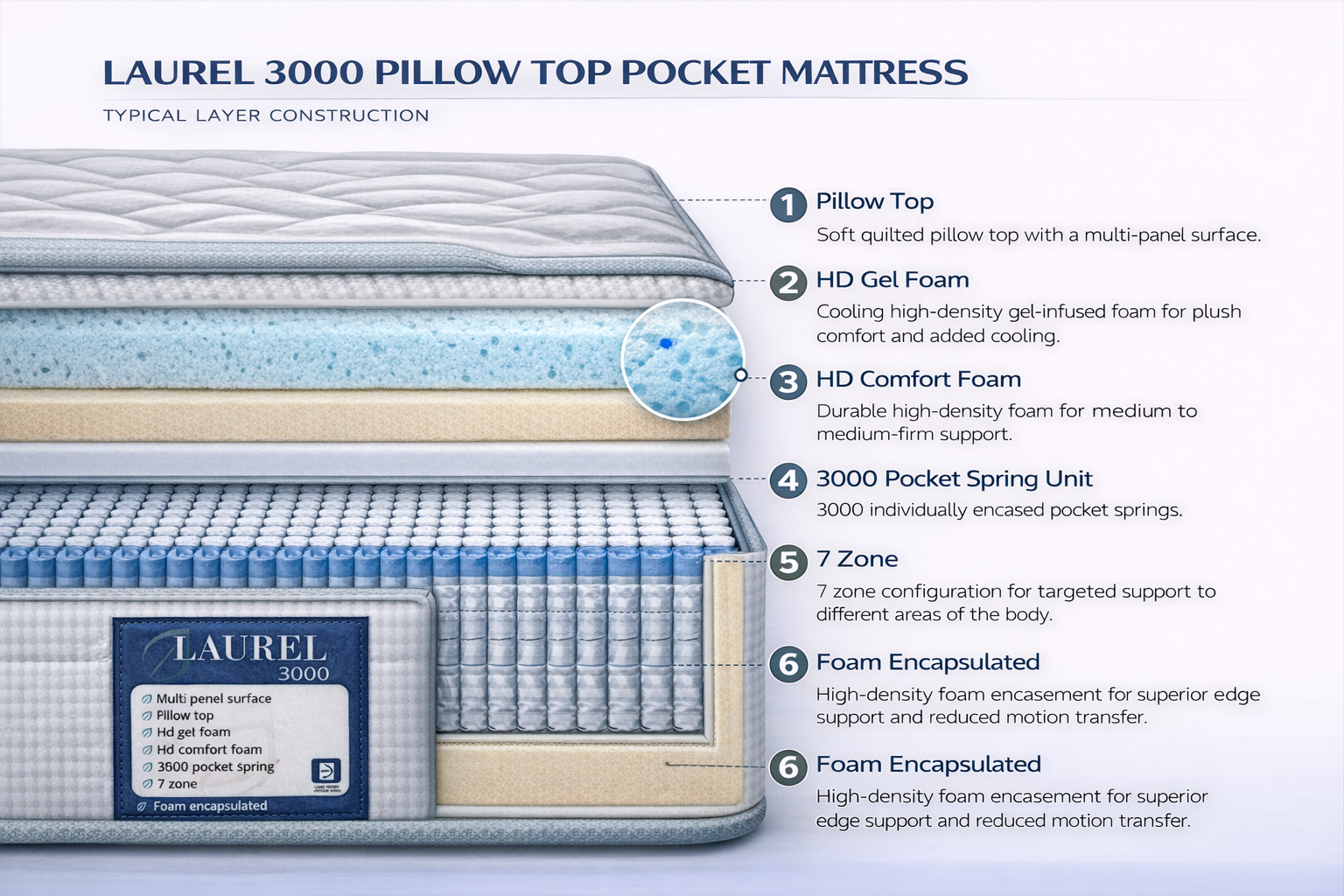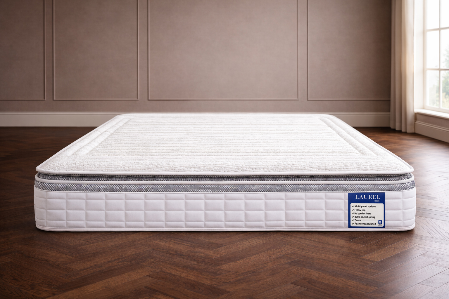 Each piece of the premium Laurel 3000 pocket-sprung mattress is manufactured with premium-density layers that allow smooth movement and excellent thermal regulation.