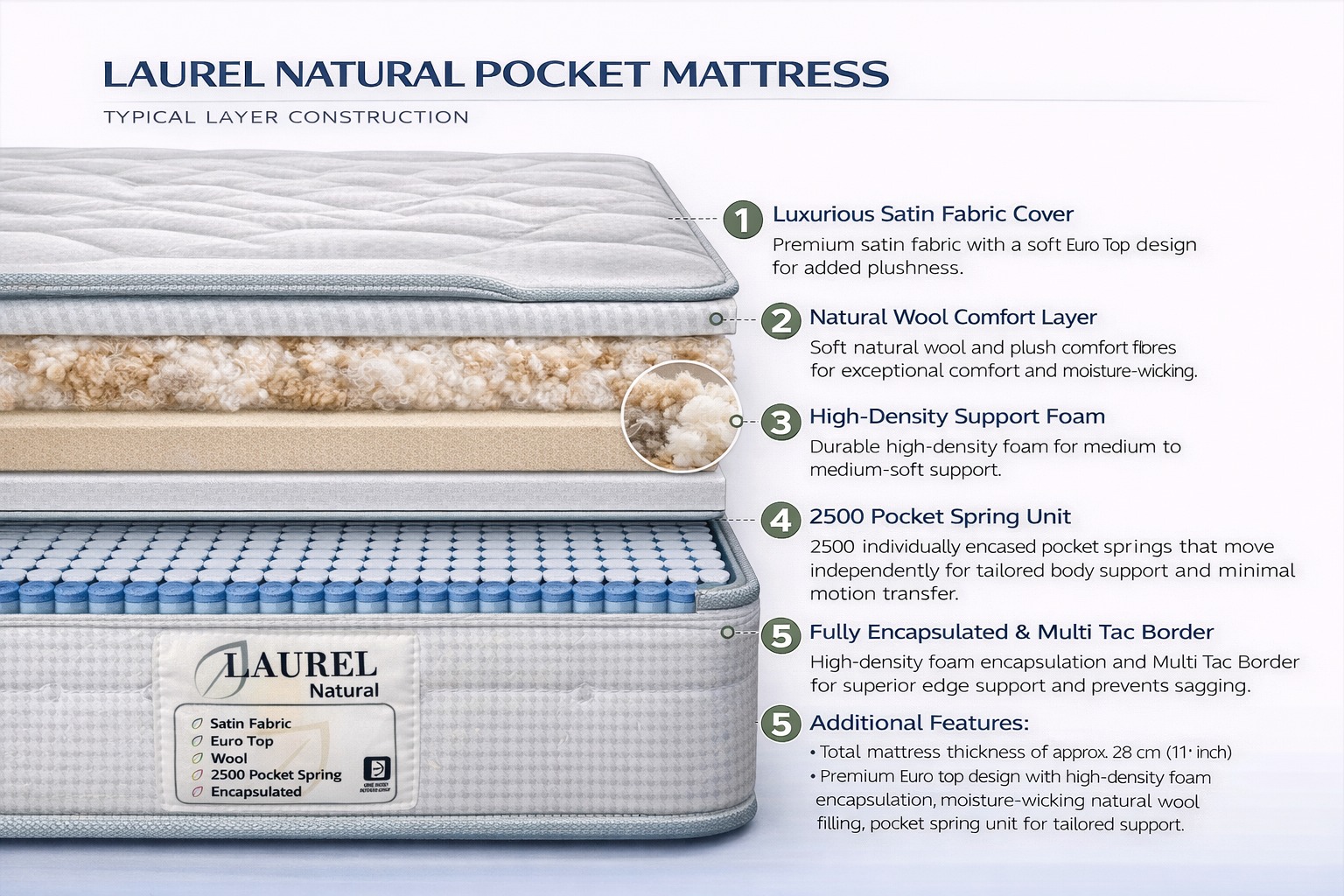 With wool’s unparalleled natural properties, the pocket-sprung Laurel Natural mattress provides a dry, comfortable sleeping surface in every season.